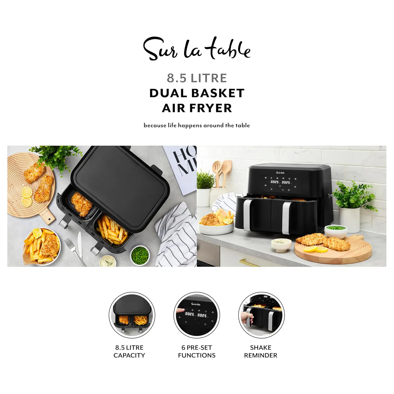 The Sur La Table SLT17014BLK duo basket digital air fryer is a faster, more energy-efficient alternative to oven cooking. With two 4.25L non-stick baskets, it's perfect for family meals. You can create crispy dishes with little to no oil for healthier cooking. Smart Finish cooks two foods simultaneously at different times and temperatures, finishing together. Dual allows both baskets to cook at the same temperature and time, easily doubling your portions. Includes six pre-set options for Fries, Chicken, Steak, Bake, Reheat, and Dehydrate to simplify your cooking at the touch of a button. A shake reminder ensures even results. This dual basket air fryer also features adjustable temperatures, a digital LED display, auto-off safety feature, and non-slip feet. The non-stick grill plates makes it versatile and easy to clean. Explore and be amazed at what you can cook.