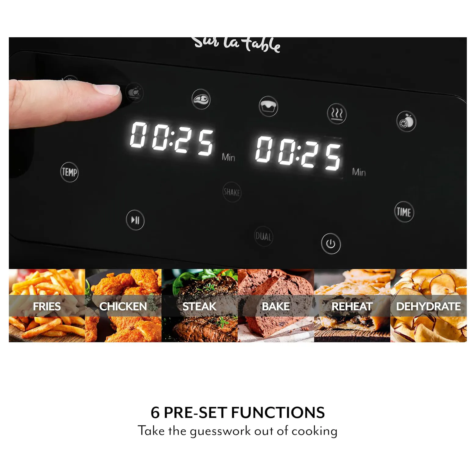 • 6 Functions: Air Fry. Roast. Steak. Bake. Dehydrate. Reheat