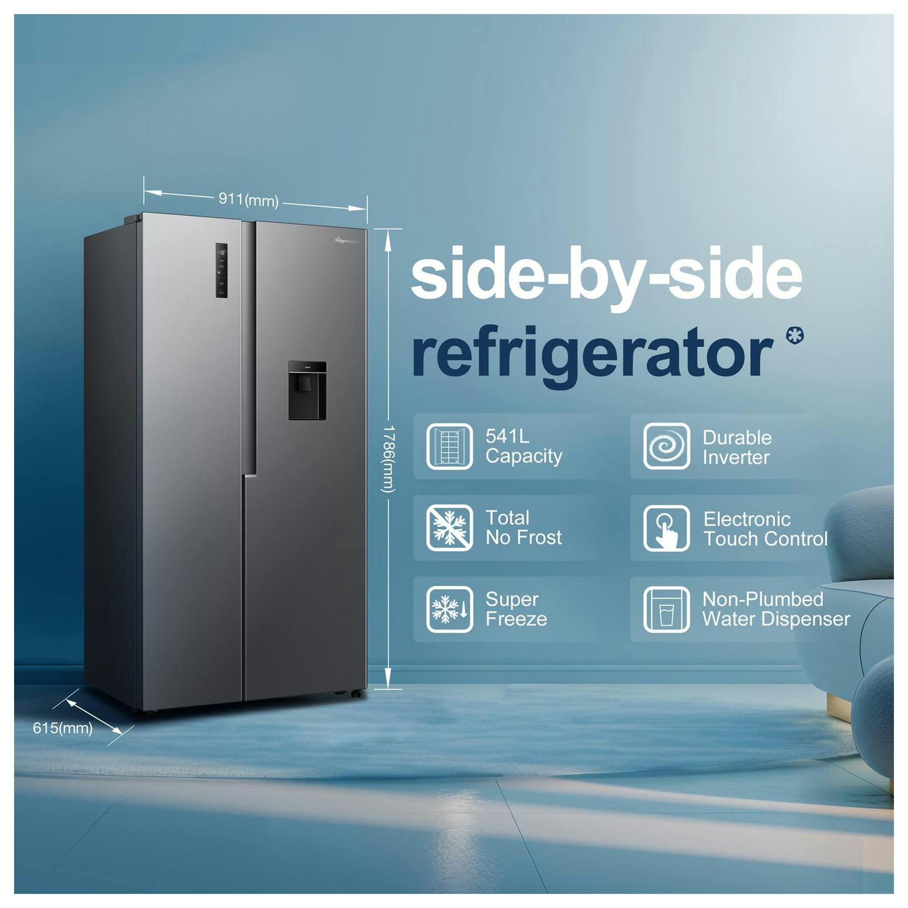 Experience spacious and efficient food storage with the Fridgemaster MS91558DES, a 91.1cm American fridge freezer featuring a 60/40 configuration. Boasting a generous 541L capacity, it offers ample room to keep your family’s groceries, batch-cooked meals, and frozen essentials organised without wasting space. Its modern silver finish complements contemporary kitchens while ensuring long-lasting durability.