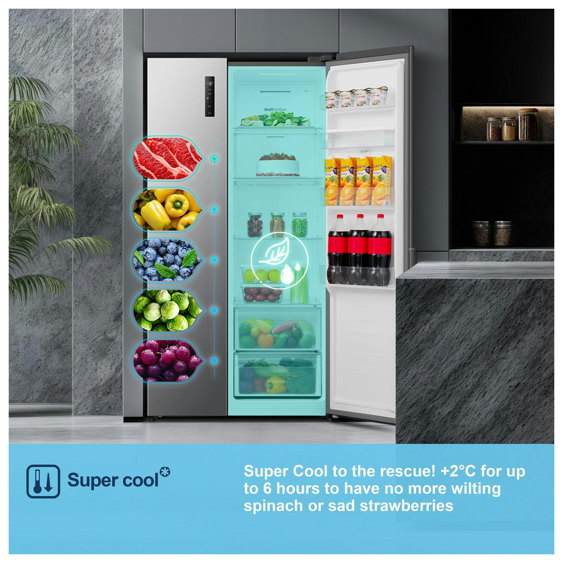 Designed for households seeking convenience and ease, this fridge freezer incorporates Total No Frost technology, eliminating the hassle of defrosting by preventing ice build-up entirely. The integrated Durable Inverter compressor adapts to temperature needs quietly and efficiently, reducing energy consumption and noise disturbances. Meanwhile, the Multi Air Flow System ensures consistent cooling, keeping all food items fresh and evenly chilled from top to bottom. An added feature is the non-plumbed chilled water dispenser, offering instant hydration without complicated installation.