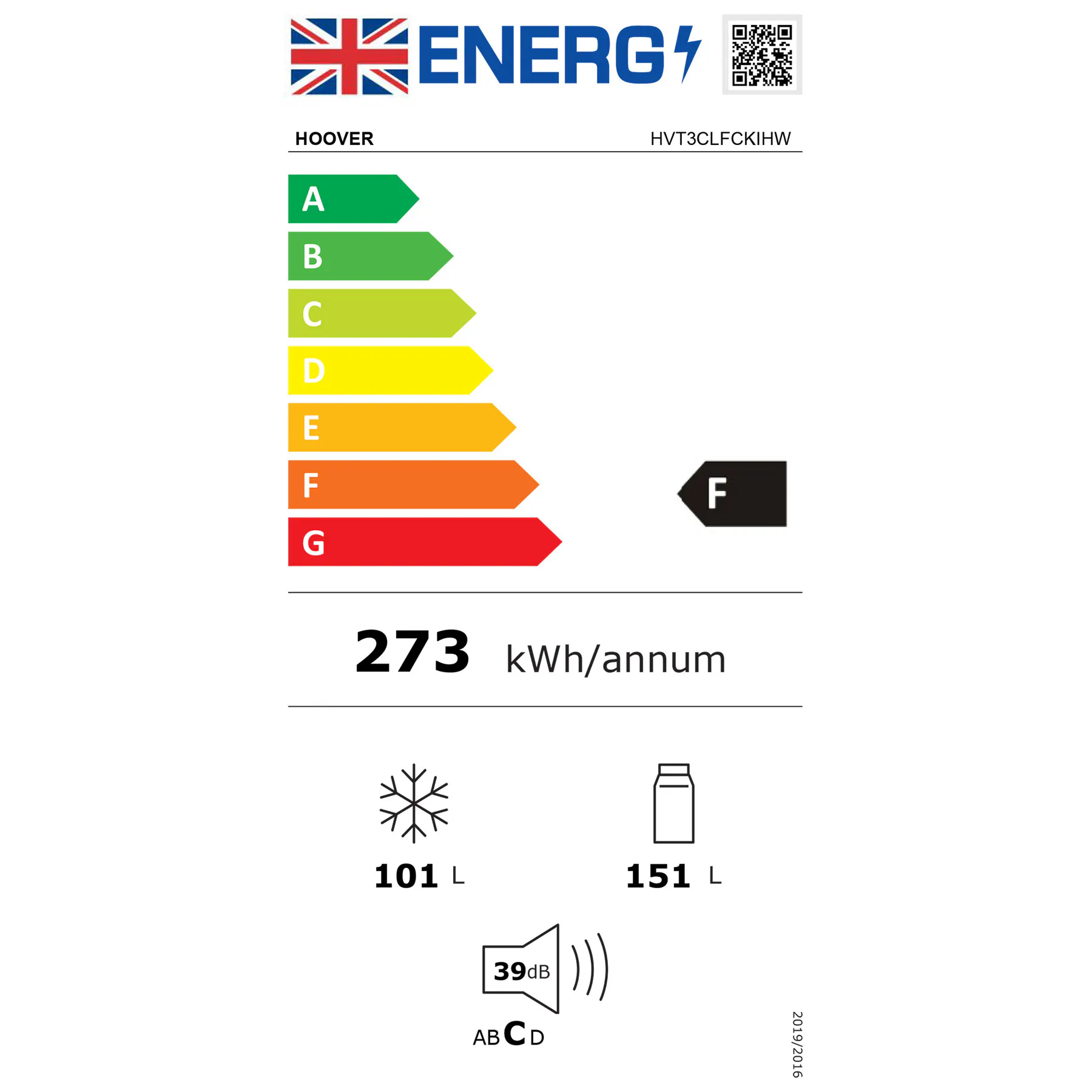 Hoover’s freestanding HVT3CLFCKIHW includes an energy efficient LED internal light, which consumes less electricity than a standard bulb. Plus, producing a noise level of just 39 dB, you won’t even notice your fridge freezer running.