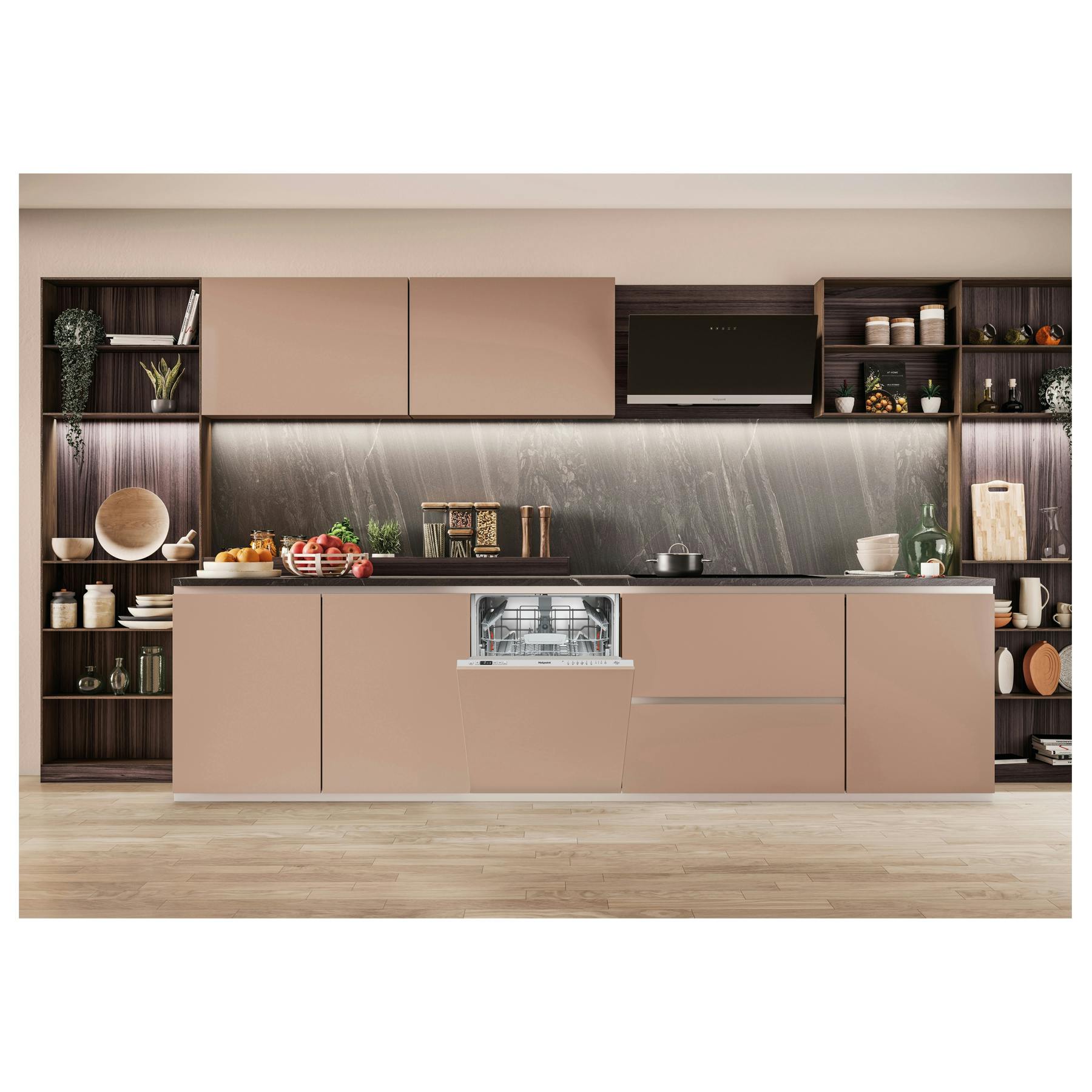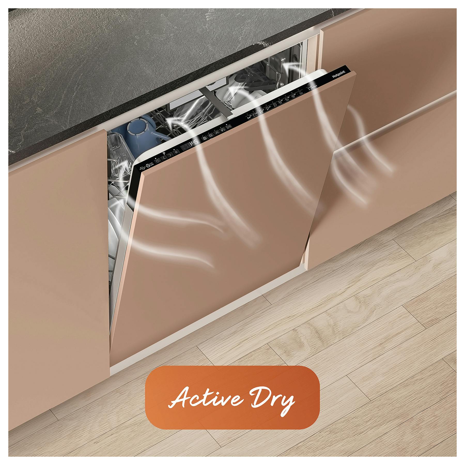 This Hotpoint integrated dishwasher offers 9 wash programmes, from a Rapid 30-minute cycle for light loads to a Sanitising Cycle that removes up to 99.999% of bacteria for a hygienic finish. The flexible adjustable baskets make room for trays, pots and pans, while Auto Programmes optimise energy, water and time use, saving up to 50%. For even more efficiency, ActiveDry technology opens the door at the right time for 99% better drying and 40% energy savings.