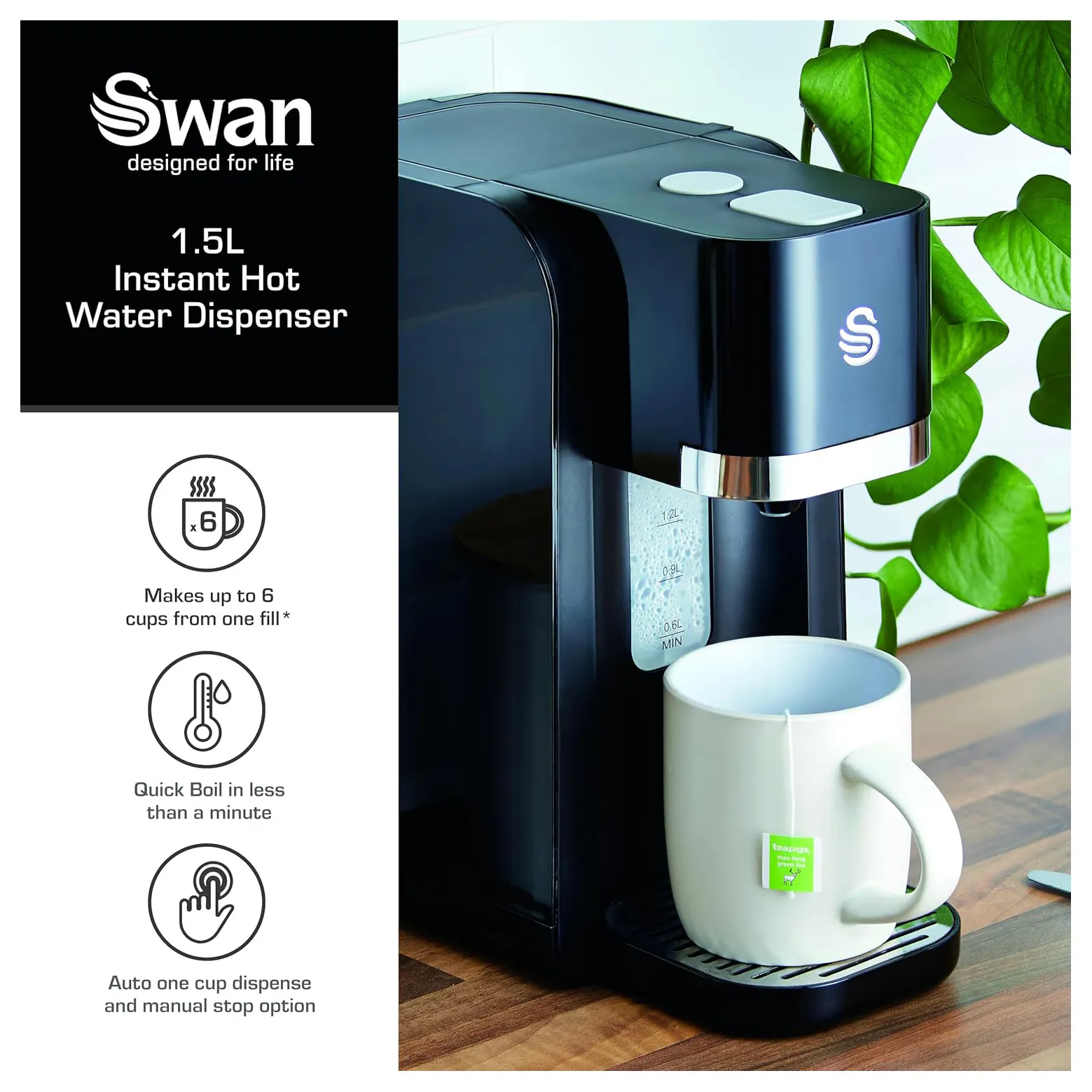 If you need a hot drink or snack in a hurry, the Swan one cup hot water dispenser provides fast boiling. With a simple button press, get a cup of instant boiling water in less than a minute. It only boils the amount of water you need, so a great time and energy saver.