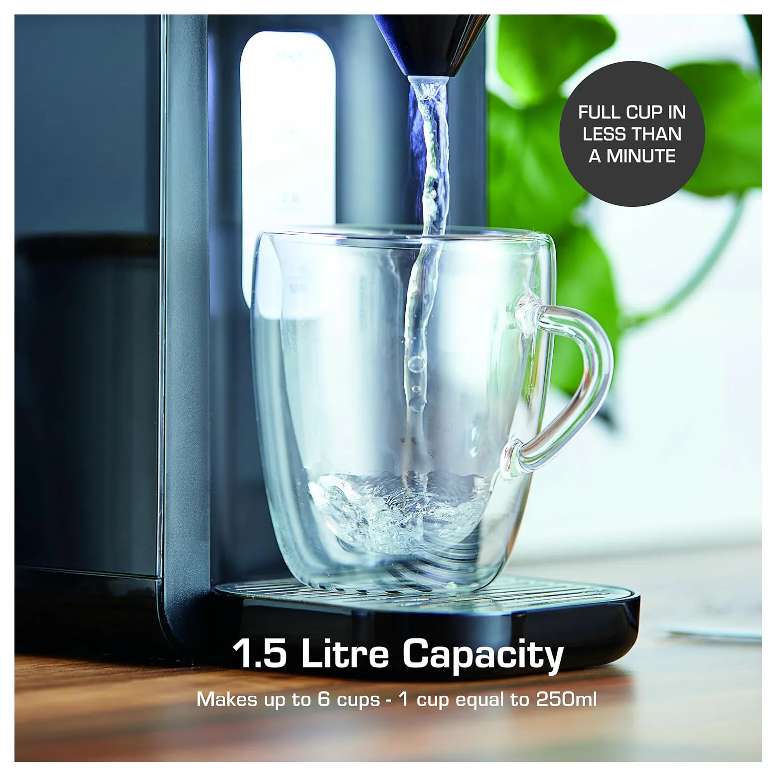 Features a 1.5 litre water tank for easily making up to 6 cups of tea, instant coffee, hot chocolate, noodles from one fill. It’s the perfect addition to any home.