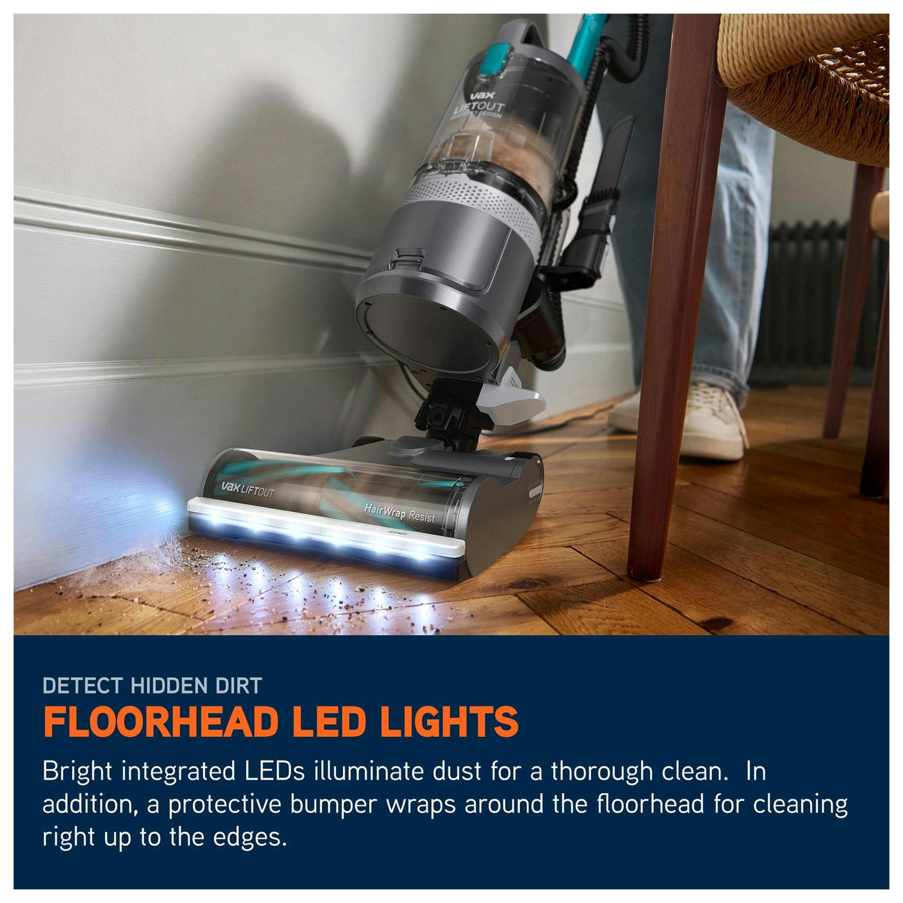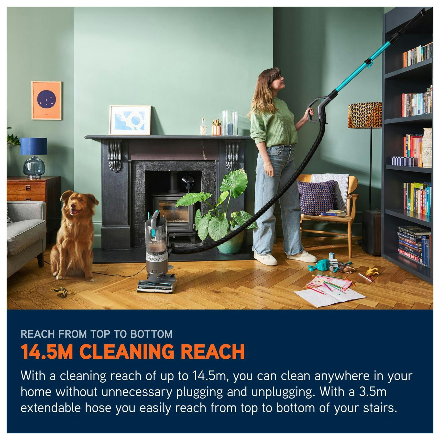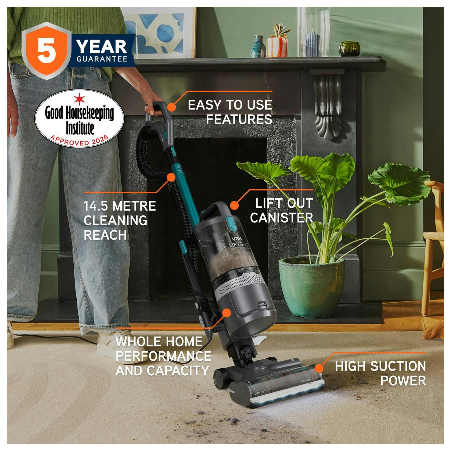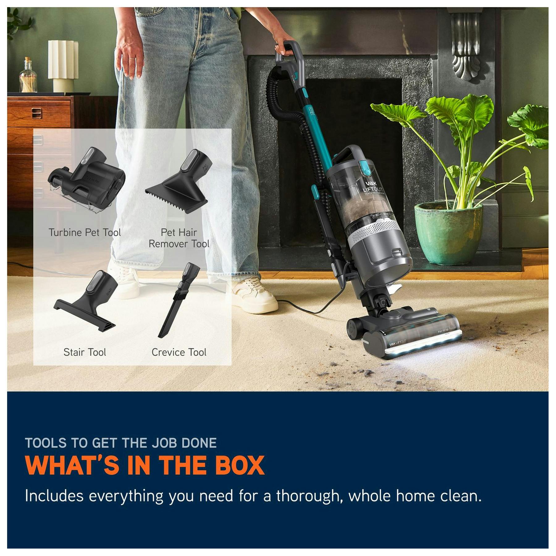 Discover the Vax CDUP-LORP LiftOut Reach Pet-Design Upright Vacuum Cleaner in Graphite and Teal, designed for effective whole home cleaning with powerful performance. This multi-functional lift-out vacuum features a 14.5m cleaning reach and HairWrap Resist technology, tackling hair and dirt on all floor surfaces. Its 2-litre capacity supports longer cleaning without frequent emptying, while LED lights on the floorhead illuminate dust in low-light areas. Protective features guard your furniture and skirtings from accidental damage during use.