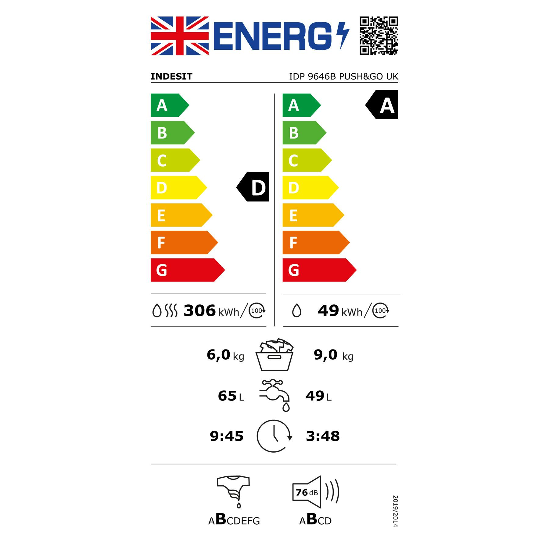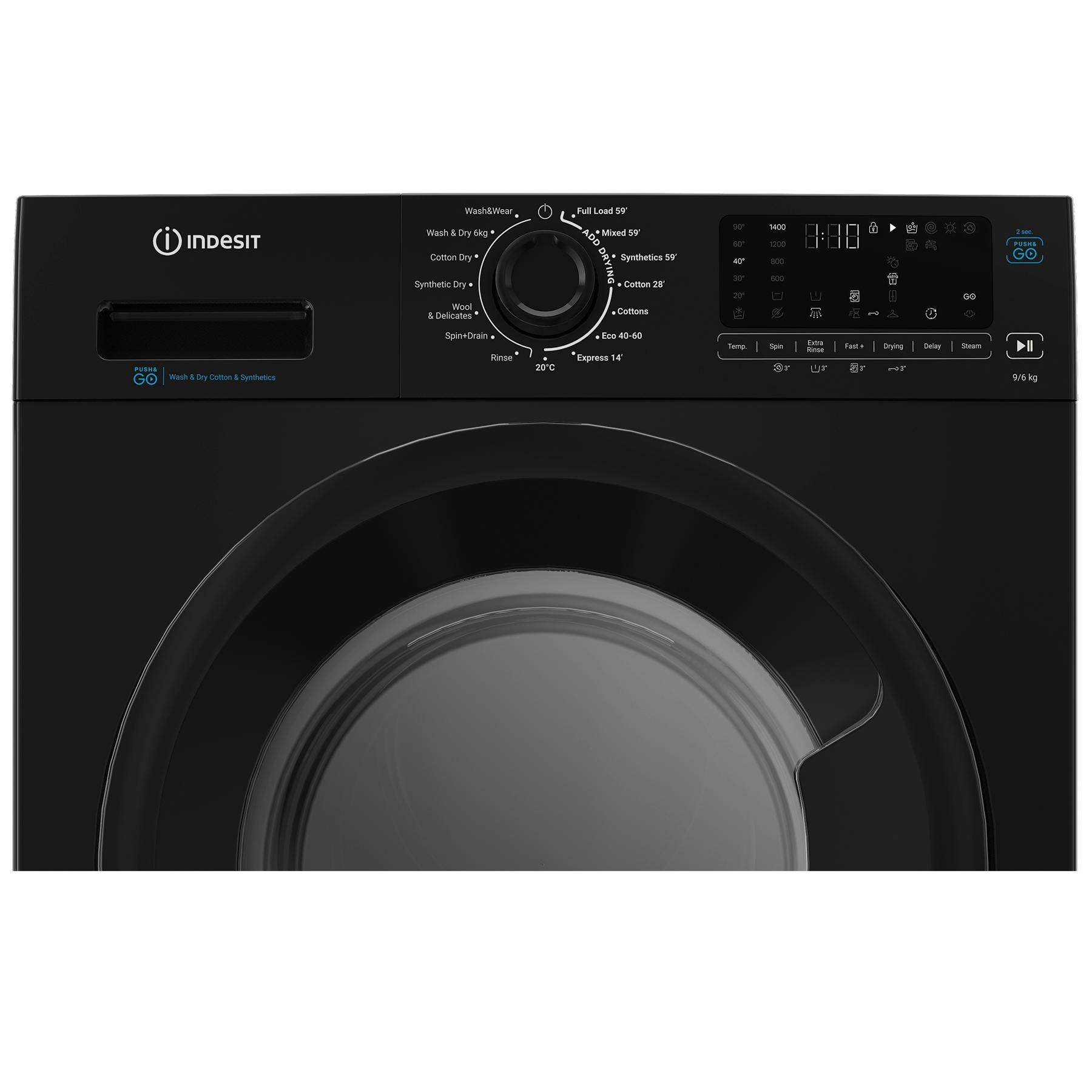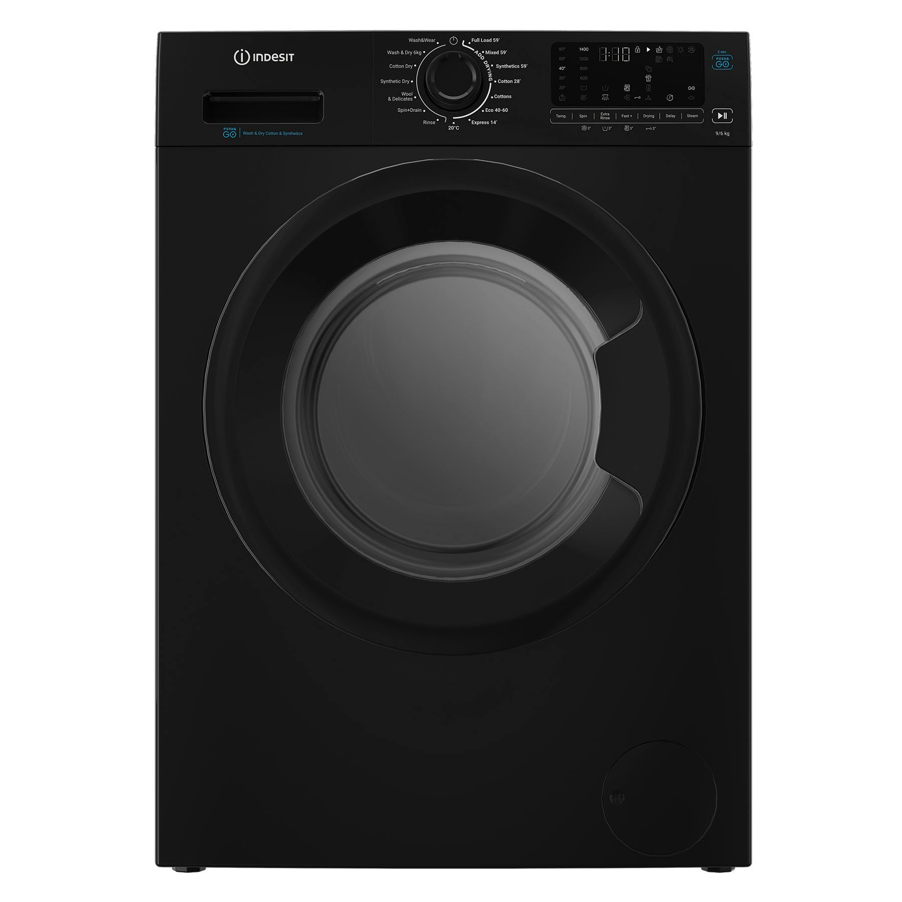 • Indesit IDP9646BPUSH Washer Dryer in Black 1400 Spin 9kg/6kg D Rated Push&Go