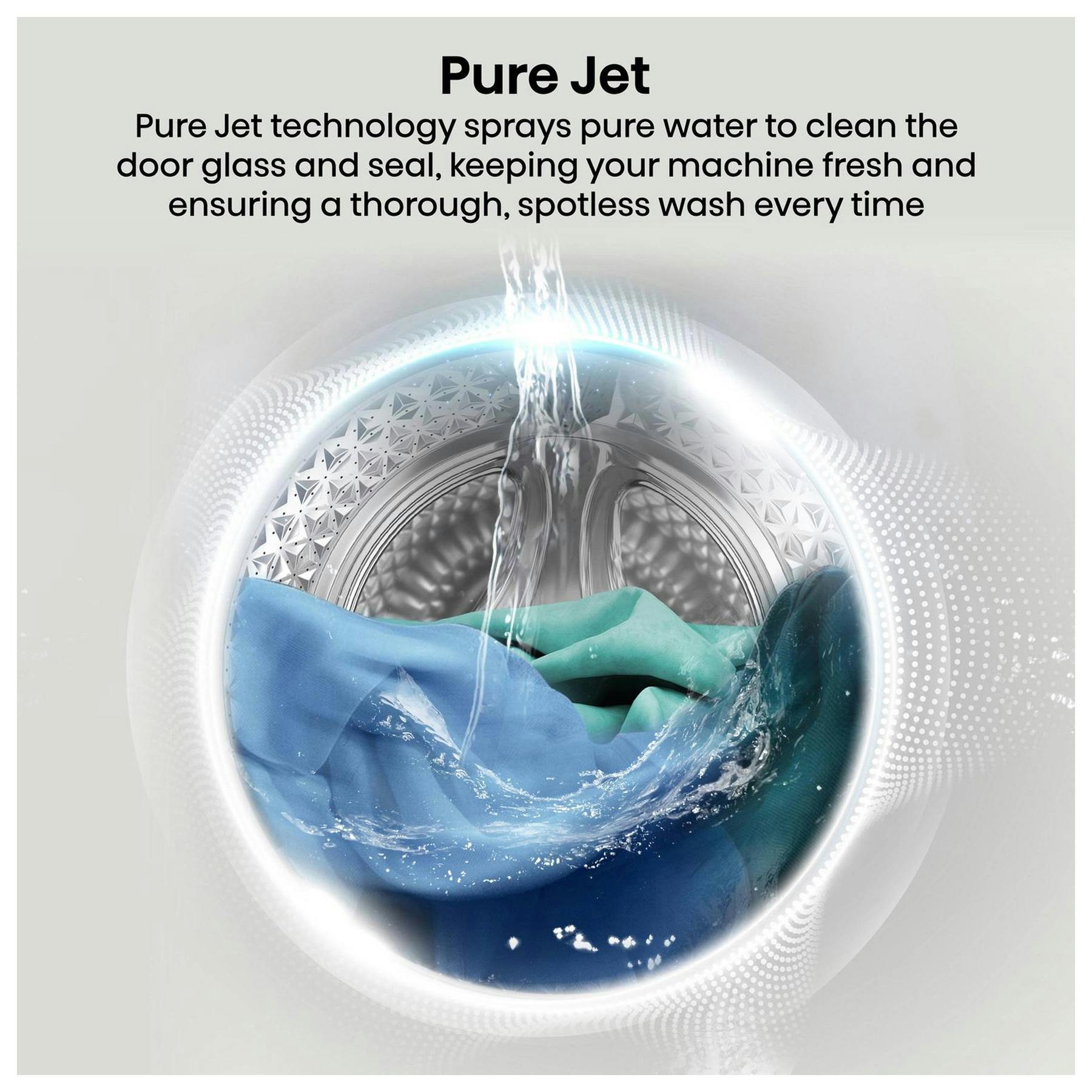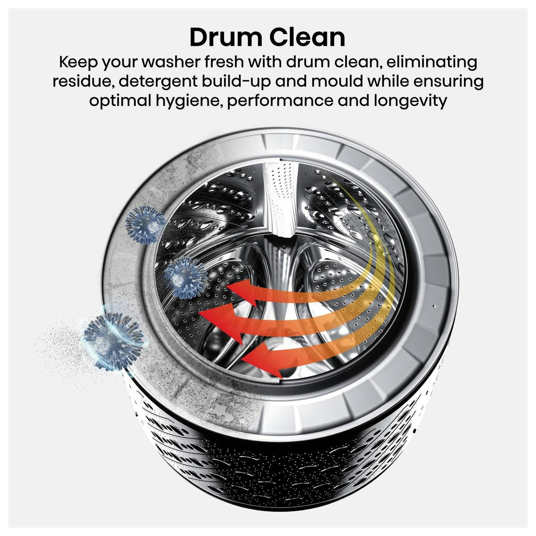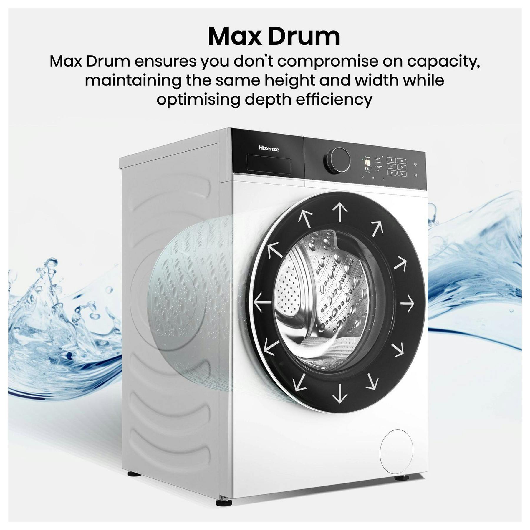 Discover the Hisense WF5I9043BWFS washing machine, featuring a 9kg capacity and 1400 rpm spin speed in a sleek white finish. Its KitchenFit design allows for a shallow depth that fits flawlessly into compact spaces while the innovative Max Drum optimises depth without sacrificing load size, ensuring powerful cleaning in a space-efficient package.